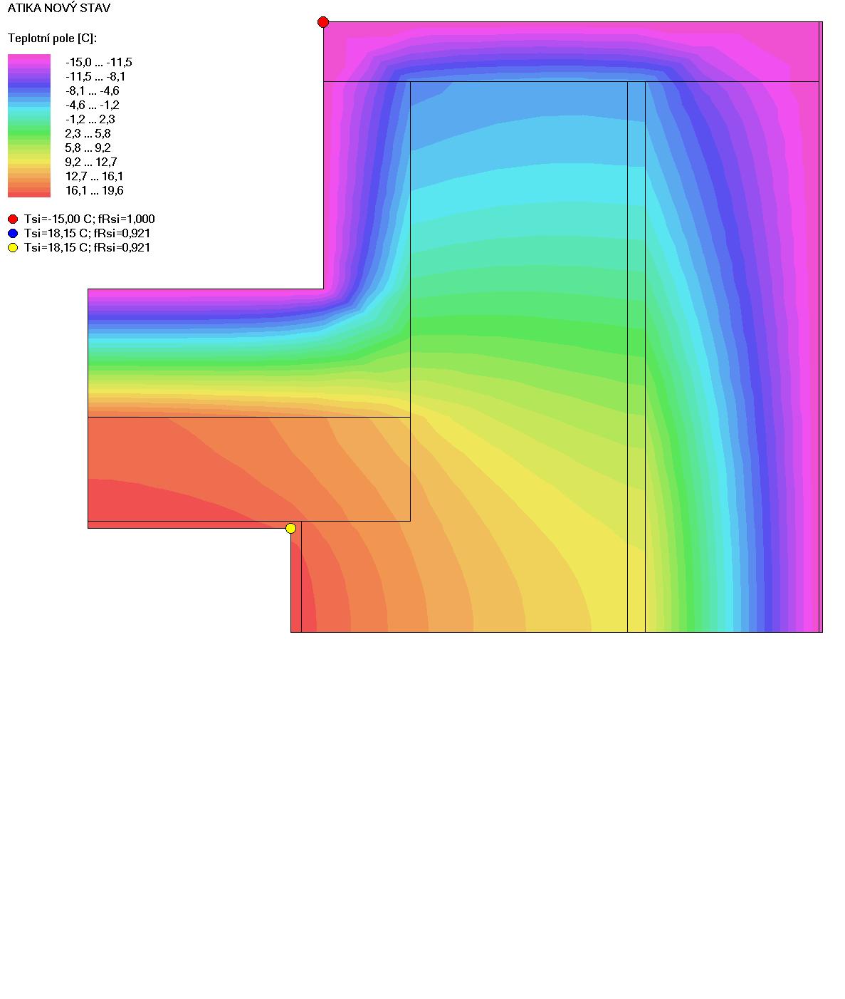 Výsledkem je zmíněný lineární činitel prostupu tepla, tedy Psí a pro nestavaře velice pěkný a barevný obrázek s rozložením teplot.